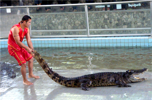 这里的驯鳄表演,是外国旅游者争相一睹的节目。