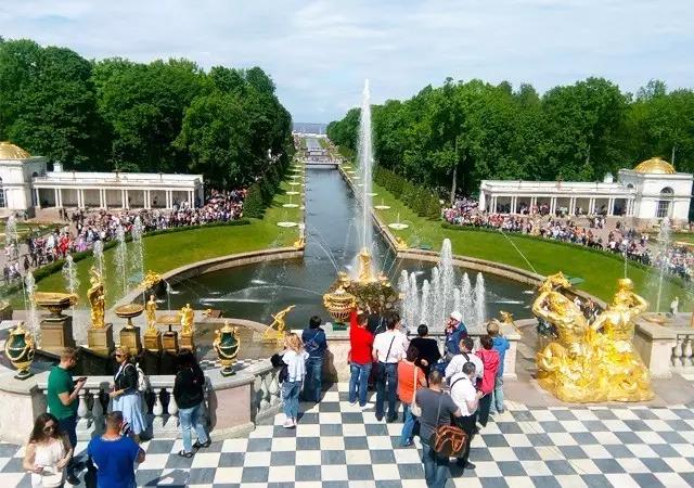 在夏宫的花园有百余座雕像,150座喷泉,正面的大喷泉梯直达波罗的海。