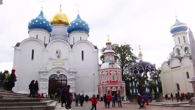 谢尔盖耶夫镇最著名的教堂群——谢尔盖三圣大修道院,有洋葱头型的蓝色圆顶等各种风格的教堂,这里有名的圣水我们也来尝尝。