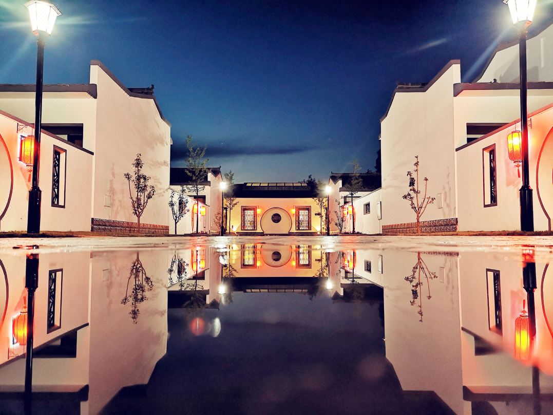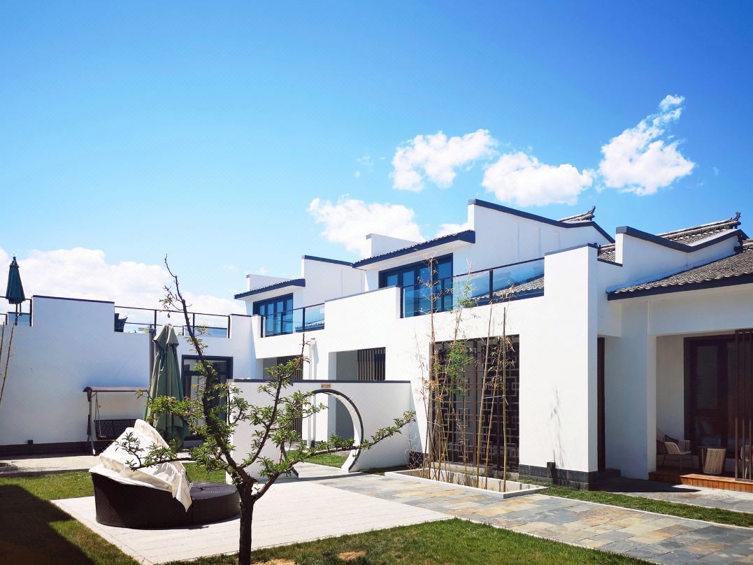 一棵树民宿,北京特有的新徽派建筑,青砖黛瓦马头墙,回廊挂落花格窗,大道的两旁依次排列着生春庭、芳游庭、云赏庭、万泽庭、无华庭和归林庭六座徽式庭院,6个私密庭院,十余套精品客房,粉白色白墙,飞檐雕柱,高低错落,层叠有致,在蓝天白云的衬托下变得熠熠生辉,贴心管家式服务,像回到家一样的温馨。