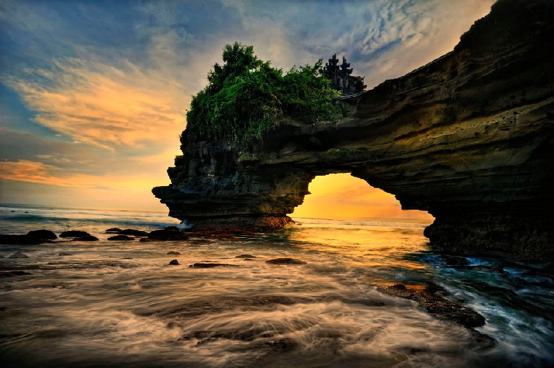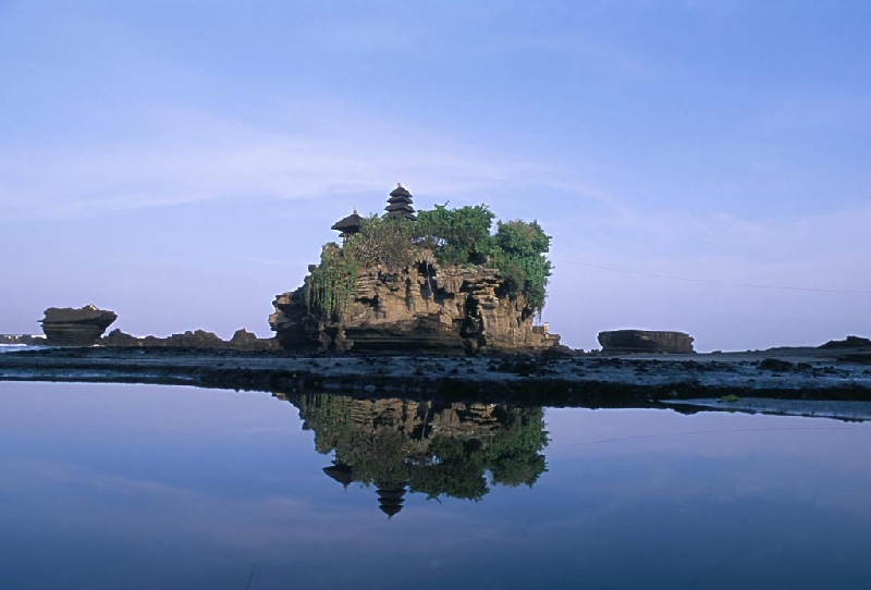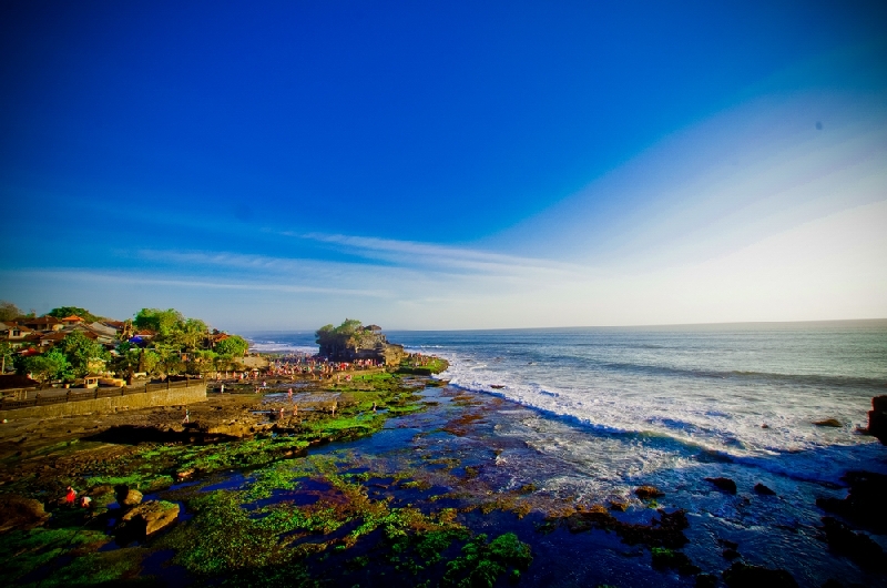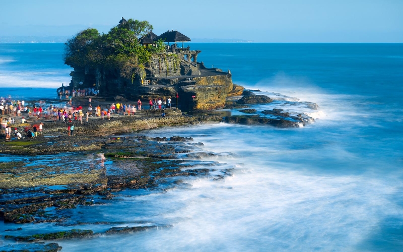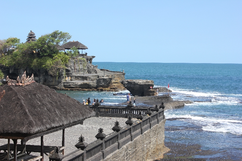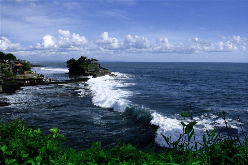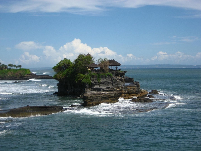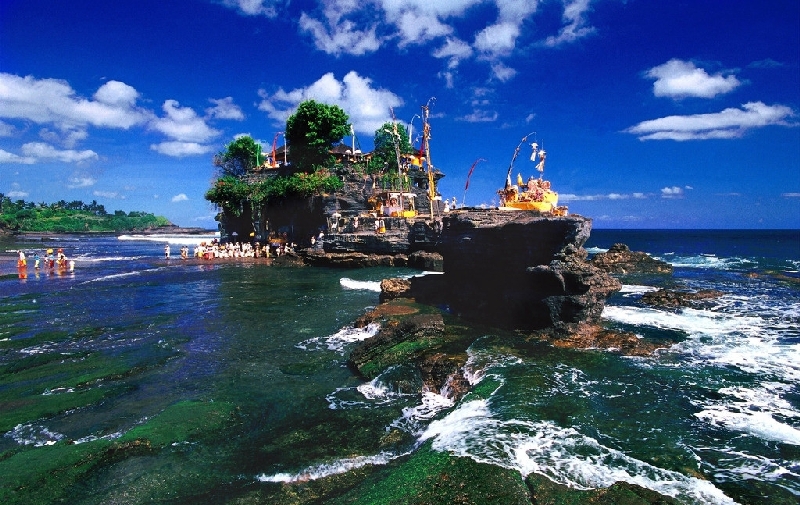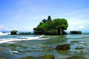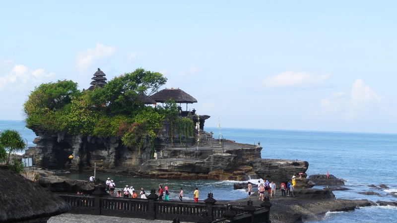 海神庙是巴厘岛最重要的海边庙宇之一,始建于16世纪。该庙坐落在海边一块巨大的岩石上,每逢潮涨之时,岩石被海水包围,整座寺庙与陆地隔绝,孤零零地矗立在海水中;只在落潮时才与陆地相连。