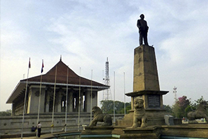 广场的主建筑物有一个纪念堂,还有一个喷水池,纪念堂的四周环 着象徵斯里兰卡的狮子雕像,纪念堂模仿康提佛牙寺后方的佛殿而建,以一根根方形的柱子 撑的构造,柱子上与屋檐下都有精致的雕刻,墙壁上并绘有斯里兰卡建国历史。