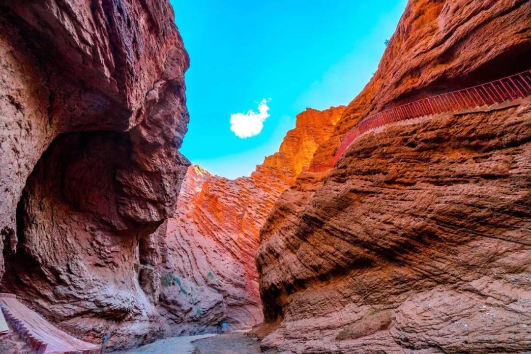 早餐后前往温宿大峡谷,它位于温宿县境内天山山脉中段南麓前山区博孜敦柯尔克孜 民族乡境内,大峡谷距温宿县城东北约 80 公里,总面积 200 平方公里。这里曾是通往南北天山古代驿路木扎特古道的必经之地,当地称之为"库都鲁克大峡谷",维吾尔语意为" 惊险,神秘"。是中国西部最美的丹霞地质奇景、中国最大的岩盐喀斯特地质胜景。进入景区,犹如进入了一片精美雄浑的自然画廊。峡谷中山壁岩层分布清晰,受挤压形成的褶皱,弯曲的线条十分清晰,断裂的岩石夹在山壁岩层中,在历经亿万年的风雨侵蚀后,形成了绝壁高耸、奇峰兀立、形态各异、嶙峋怪异、色彩浓烈、千姿百态、五彩纷呈的奇特景观。