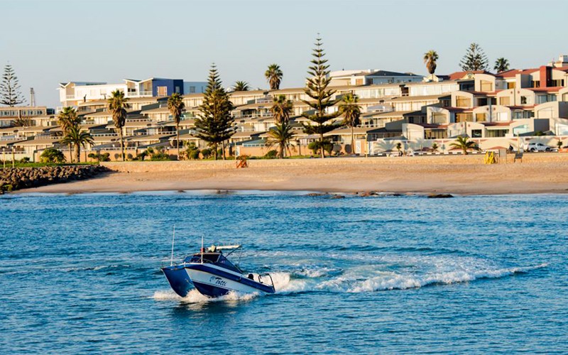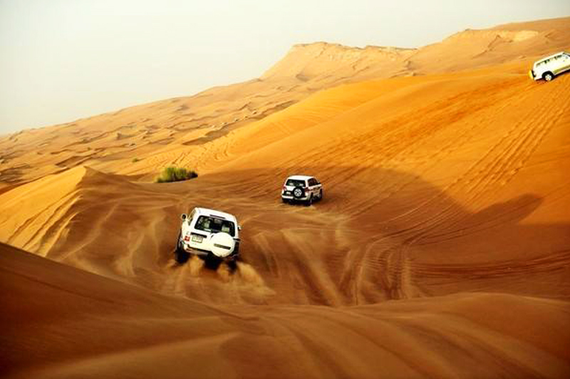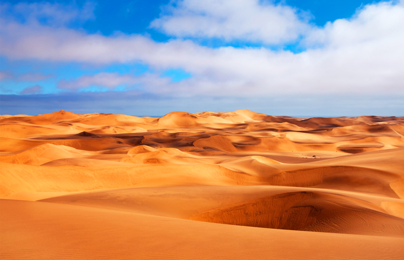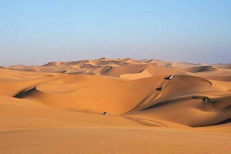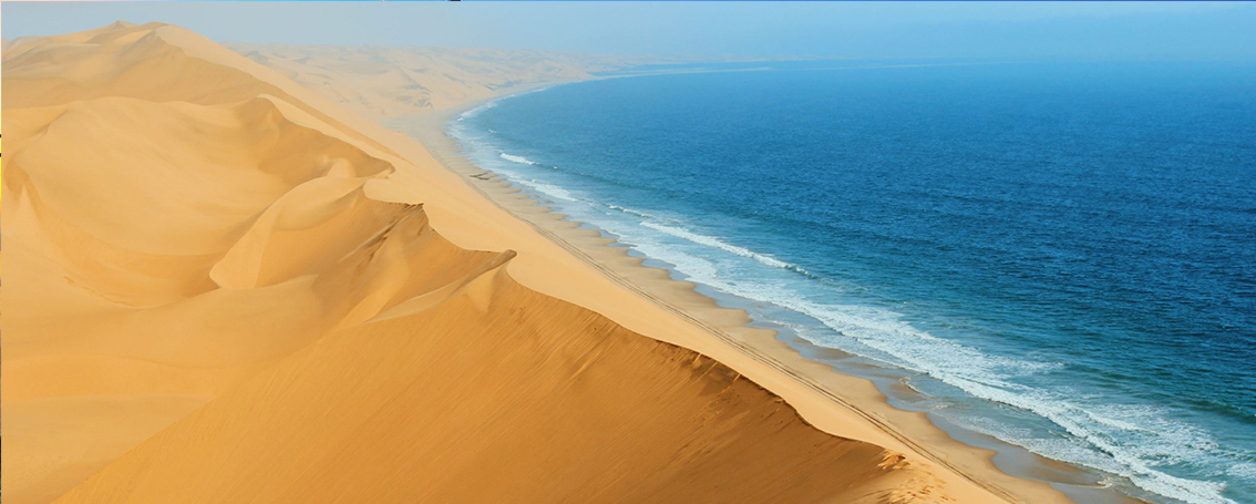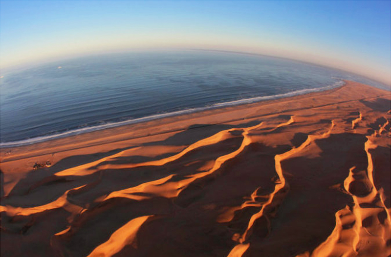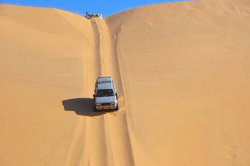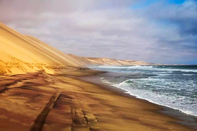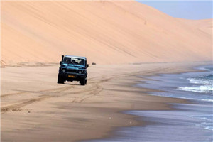 乘坐四驱车开始奇妙刺激的三明治湾沙漠巡游。四驱越野车带领我们在高耸的沙丘中俯冲,时而停在沙丘顶端观看倒沙入海的壮阔奇景。