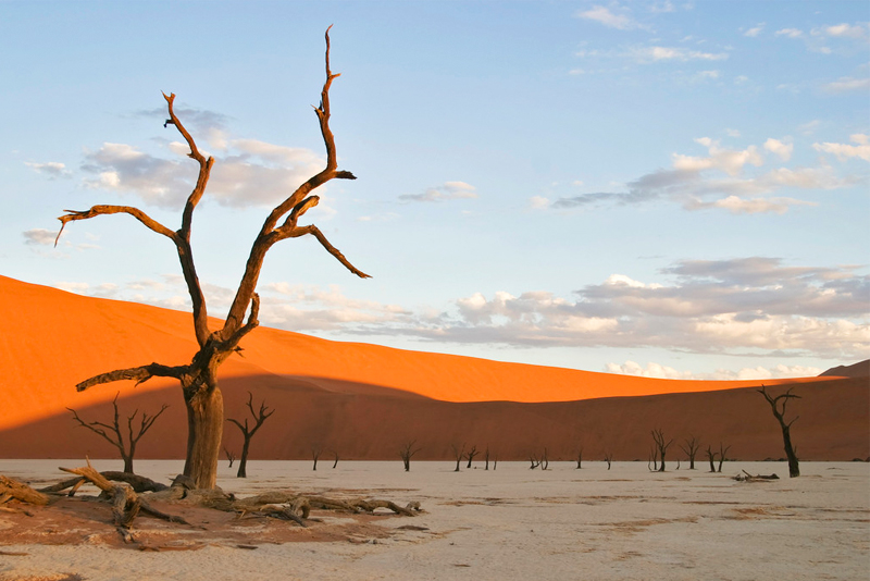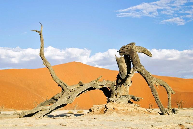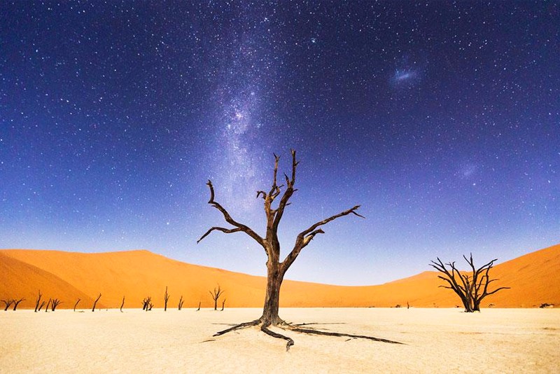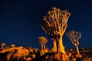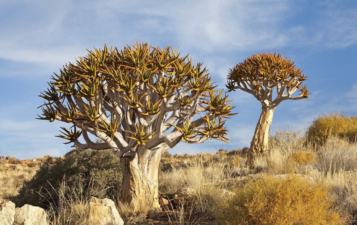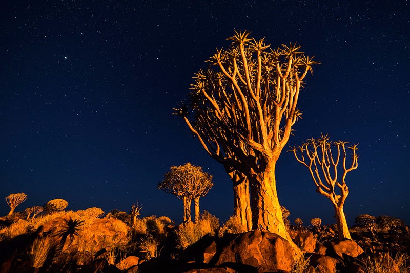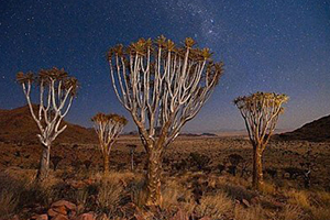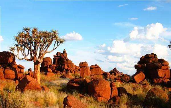 箭袋树是沙漠里最有智慧的树,它们会在极度缺水的时候断下自己的树枝以保存生机,树皮表面的白色粉状分泌物有助于阻止水分流失。箭袋树公园里怪石林立,巨大的玄武岩石块散落在草原上,被誉为“巨人的游乐场”,这里的光污染很低,也是极佳的观星地,纳米比亚世界闻名的一张照片“星空下的箭袋树”就是在这里拍摄的,因此也是众多摄影爱好者的必到之处。